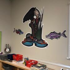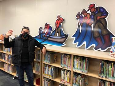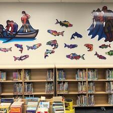 Staff and students at Bradner are so excited to announce that our Library Learning Commons art is here and up on display for all to enjoy! Local Indigenous Artist Jay Havens created this unique work for us over the past two years. He blended the traditional Woodlands art style he is so well known for, with contemporary a digital medium to create 5 panels representing local indigenous history and to tell a story about salmon. He worked with students to share with them the importance of salmon to the indigenous people of the Fraser Valley, and supported them to create their own digital Woodlands style salmon art. Then he selected 22 fish made by students to include in the mural.