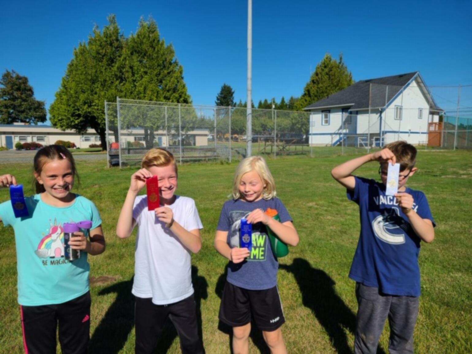Ribbons and awards used throughout the year (cross country, speeches, grade 5 achievement)